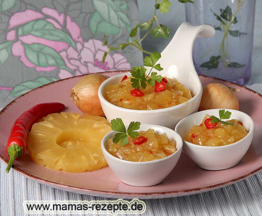 Dieser süß/saure Ananasdip schmeckt besonders fein zu gebratenem oder gegrilltem Fisch, Hähnchen- oder Putenfleisch, zum sommerlichen Grillfest, aber auch als Beigabe zum Schlemmen zu frisch aus der Pfanne gebackenen Rösti oder beliebigen Bratlingen immer wieder sehr lecker.