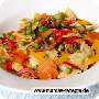 Gewaschene entkernte rote und gelbe oder grüne Paprikaschoten ebenfalls in dünne Streifen schneiden.