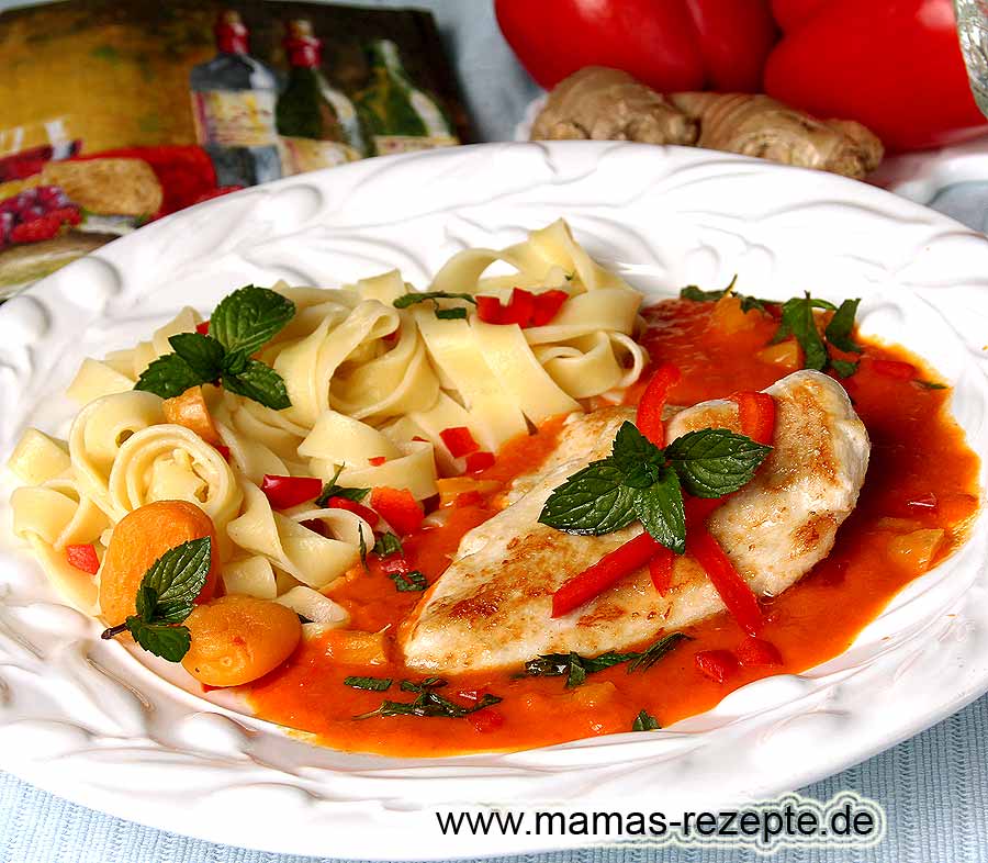 Dieses Rezept Hähnchenbrustfilet mit Paprikasauce ergibt ein leichtes Geflügelgericht mit zart gebratenem Hähnchenfleisch und einer pikant gewürzten Paprikasauce, bei welcher sich das Aroma der frischen Paprikaschoten und Ingwer, sowie der leicht süßliche Geschmack der mitgekochten getrockneten Aprikosen wundervoll zu einer wahren Geschmacksexplosion ergänzen.