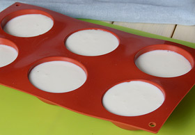 Dieses Joghurt Panna cotta nun zum späteren Stürzen des Desserts in beliebige kleinere, zuvor mir kaltem Wasser ausgespülte Tassen, Ragout Fin Formen, oder wie hier bei mir in Silikonformen (siehe 2. Bild) einfüllen und für ein mehrere Stunden, noch besser über Nacht in den Kühlschrank stellen.