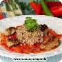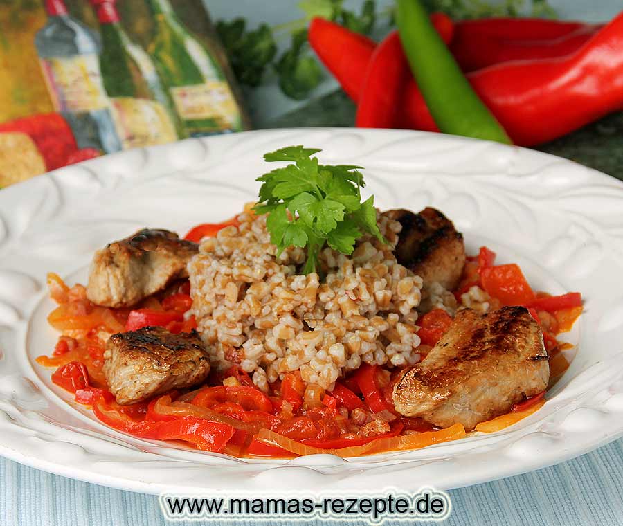 Ein pikant abgeschmecktes Paprikagemüse mit roten Spitzpaprika wird hier bei dieser Rezeptidee anstatt mit Reis mit einer herzhaften gesunden Vollkorn Dinkelkörner Beilage, welche wie Reis in Salzwasser gekocht wird, serviert.