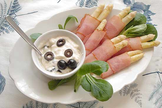 Für dieses Rezept Schinkenrollen mit Olivensoße, zur Spargelzeit frischen Spargel waschen und schälen. In kochendem Salzwasser mit einer Prise Zucker 15 Minuten kochen lassen. Spargel herausnehmen und auskühlen lassen.